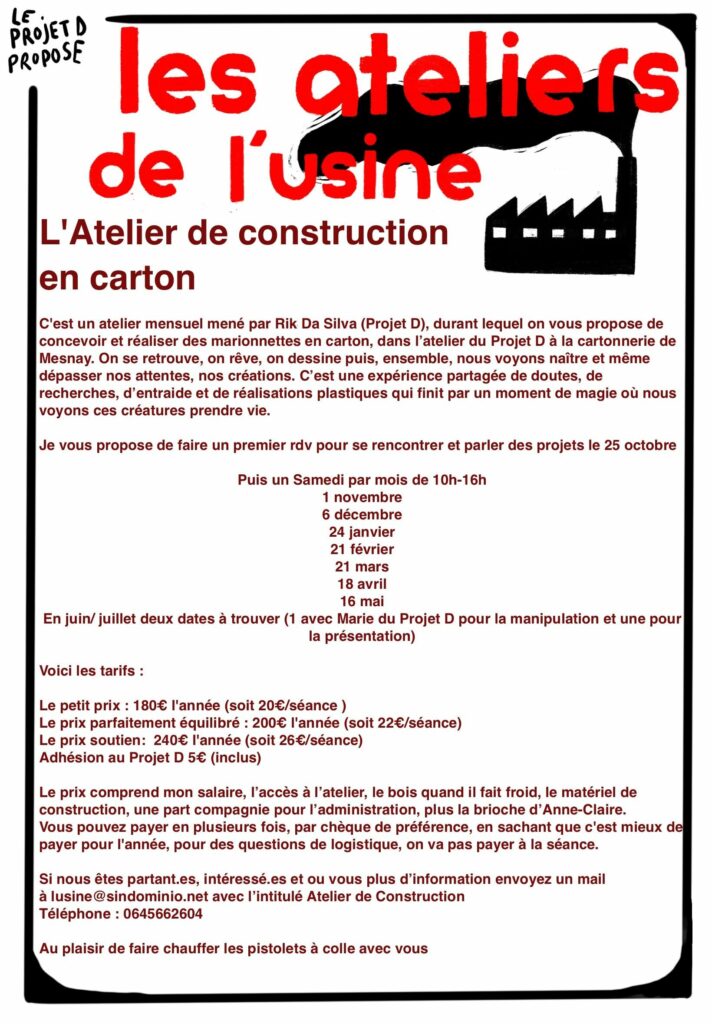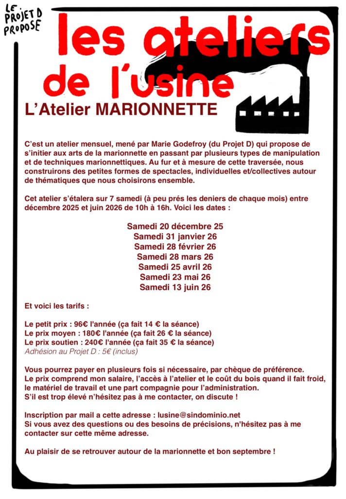 Le Projet D est un collectif créé par sept marionnettistes. Ielles se sont rencontrées lors de leurs étude, dans la 8ème promotion de l’école Nationale des Arts de la Marionnette de Charleville Mézières. Installé.es depuis 2011 dans le Jura, à la Cartonnerie de Mesnay, ou ielles ont construit leurs ateliers, le collectif invente différentes formes de constructions horizontales. Spectacles écrits à plusieurs mains, ateliers donnés pour différents publics, fêtes éphémères ou projets de territoire, le Projet D exerce l’art de la marionnette sous toutes ses formes et dans différents contextes.