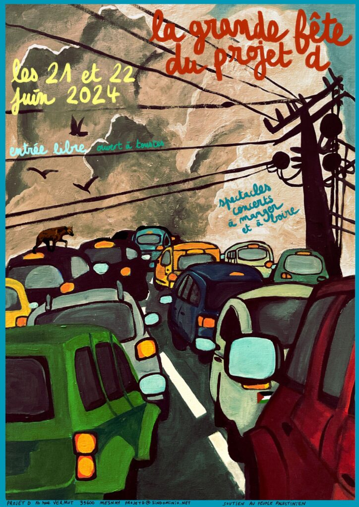 Tous les ans, au courant du mois de juin, et ce depuis 10 ans déjà, nous organisons LA GRANDE FÊTE DU PROJET D, sur le site de la Cartonnerie, à Mesnay. L’évènement commence le vendredi soir, puis continue le samedi toute la journée et toute la soirée. Nous y produisons nos spectacles, mais aussi des spectacles de personnes que nous apprécions, ainsi que des concerts le soir. Marionnettes, théâtre, musiques en tous genre. A cette occasion, nous ouvrons un bar, et servons de délicieuses pizzas, et parfois des frites. Pour nous aider, des copain.es de tous les coins ainsi que nos voisin.es les plus proches viennent nous aider à organiser, décorer, faire à manger… Sans elle.ux, cette fête n’existerait pas. Cette fête est ouverte à toustes, et tout est à PRIX LIBRE !